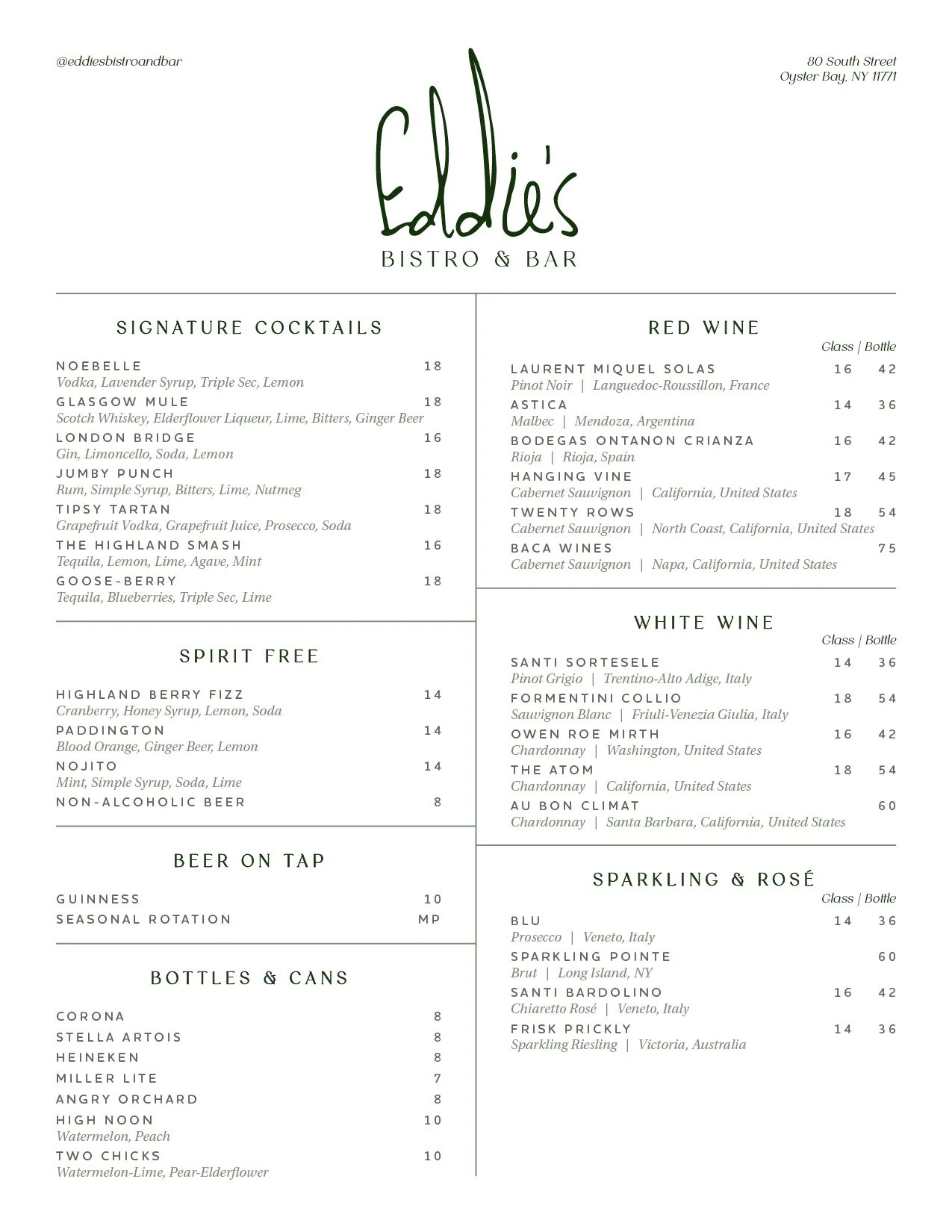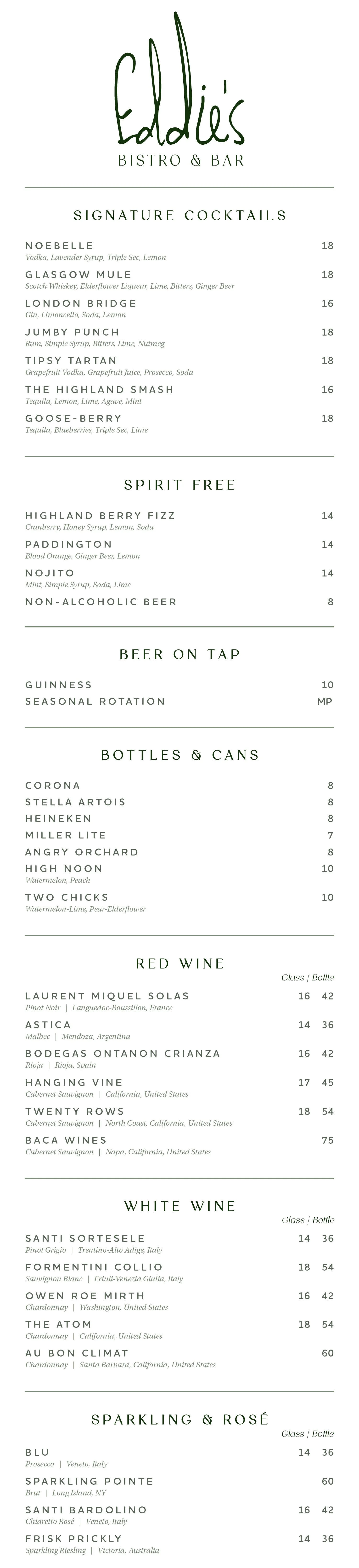 Menu of Eddie's Bistro & Bar featuring cocktails, beer, wine, and beverages.